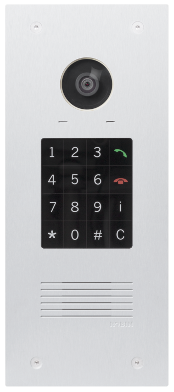 Robin Video Pro Keypad: Incorpora un teclado táctil integrado bajo una cúpula de vidrio óptico endurecido, permitiendo la marcación directa a números de extensión, la introducción de códigos PIN para control de acceso y una superficie sin ranuras mecánicas que facilita la desinfección.